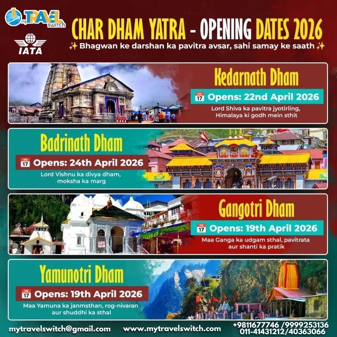 Plan your sacred Char Dham Yatra 2026 with complete details on opening dates, यात्रा मार्ग, यात्रा tips, and best travel packages. Kedarnath opens on 22 April 2026, Badrinath on 24 April 2026, while Gangotri and Yamunotri open on 19 April 2026. Discover the spiritual journey across Uttarakhand’s holy temples nestled in the Himalayas. Get travel tips, itinerary ideas, accommodation guidance, and booking assistance for a smooth and divine pilgrimage experience.