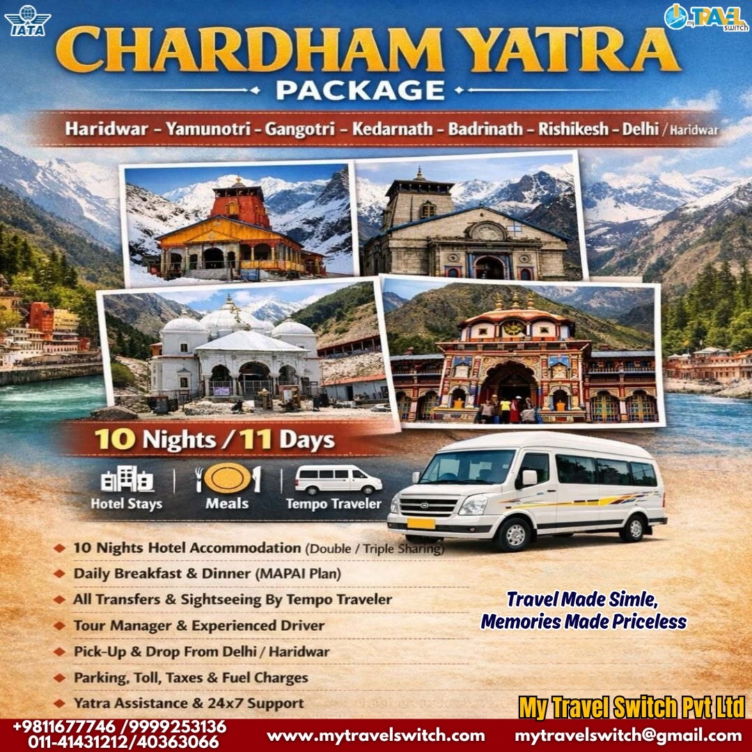 If you are planning a sacred and comfortable Chardham Yatra Package 2026, this 10 Nights 11 Days Char Dham tour package from Delhi & Haridwar is an ideal choice. Covering the holy shrines of Yamunotri, Gangotri, Kedarnath, and Badrinath, along with essential services like hotel stays, meals, tempo traveller transfers, tour manager support, pick-up & drop, and 24x7 yatra assistance, this package offers a smooth, safe, and spiritually fulfilling pilgrimage. Book your Char Dham Yatra package with My Travel Switch Pvt Ltd and make your holy journey memorable, peaceful, and hassle-free.
