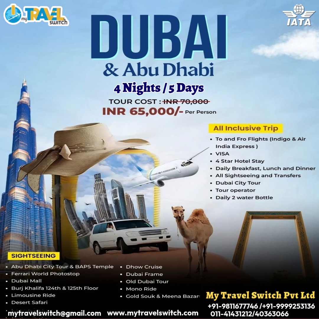 Book your Dubai & Abu Dhabi 4 Nights 5 Days Tour Package and experience the perfect international getaway at an unbeatable price of INR 65,000 per person. With flights, visa, meals, hotel stay, transfers, and the best sightseeing experiences included, this is the ideal holiday package for families, couples, and groups. Choose My Travel Switch Pvt Ltd for a seamless, luxurious, and memorable Dubai vacation.