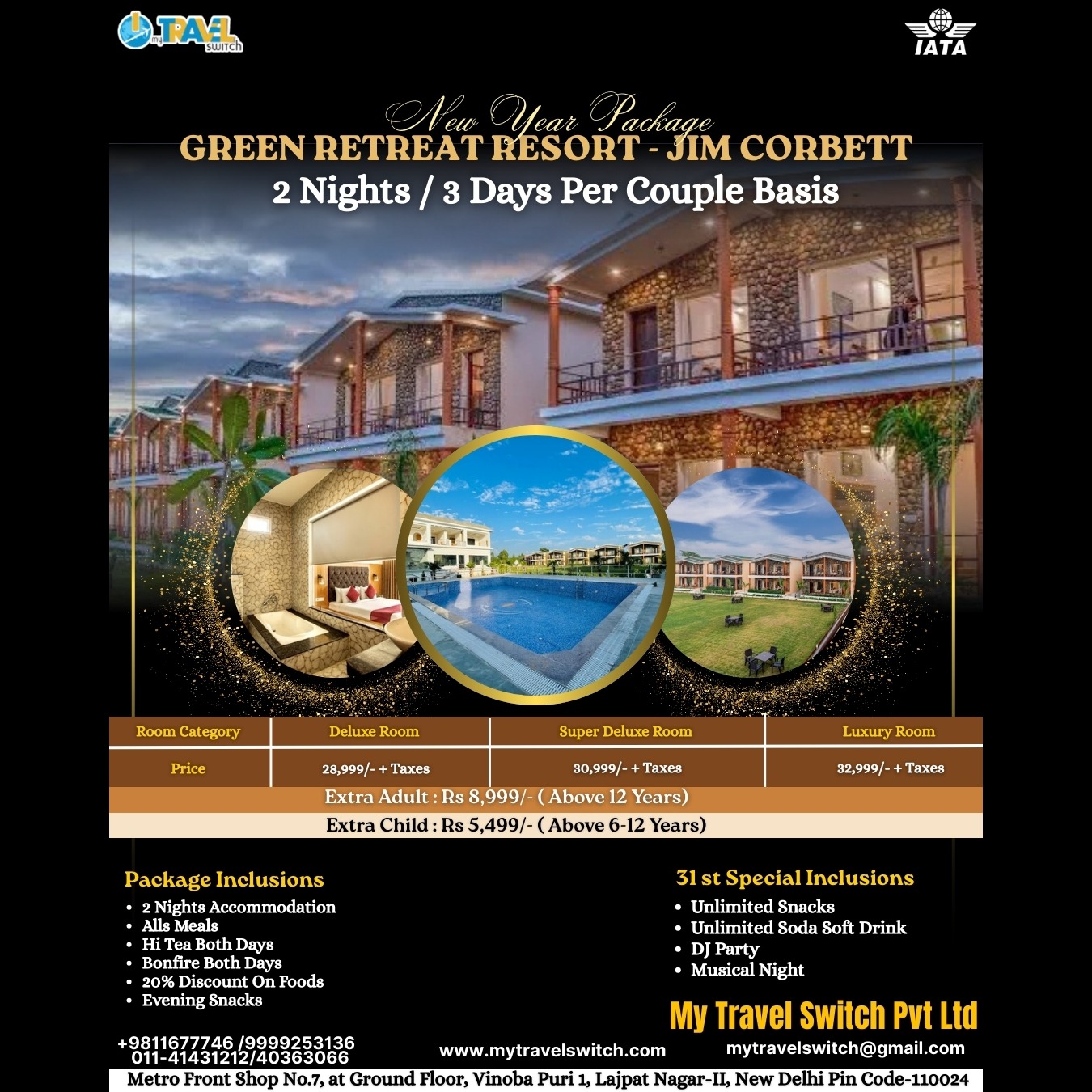 The Green Retreat Resort Jim Corbett New Year Package 2026 offers the perfect combination of luxury, celebration, and nature for a memorable year-end getaway. With premium stay options, all-inclusive meals, festive evenings, DJ night, musical events, and special 31st December inclusions, this 2 Nights / 3 Days package is designed to give you an unforgettable New Year celebration. Book your Jim Corbett New Year Couple Package 2026 now and welcome the year with style, comfort, and joy.