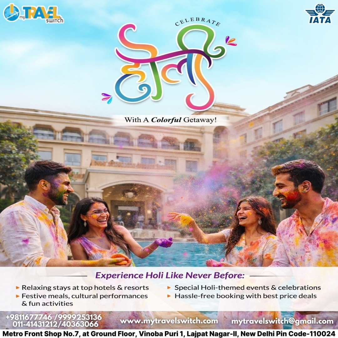 Celebrate the joy of Holi 2026 with exciting Holi getaway tour packages by My Travel Switch Pvt Ltd. Enjoy relaxing stays at premium hotels & resorts, festive meals, colorful Holi parties, cultural performances, and special themed events. Book hassle-free holiday packages at the best prices for families, couples, and groups. Experience a vibrant and unforgettable Holi vacation with us!