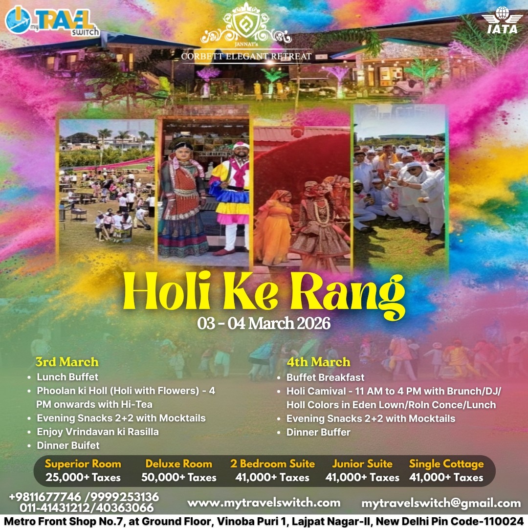 Celebrate Holi in nature with an exciting getaway at Jim Corbett National Park at the premium Jannat Corbett Elegant Retreat. Enjoy the vibrant Holi Ke Rang 2026 festival with flower Holi, DJ carnival, buffet meals, mocktails, cultural programs, and luxury stays. Book your Holi special resort package with My Travel Switch Pvt Ltd for the perfect family vacation, group celebration, or weekend escape.