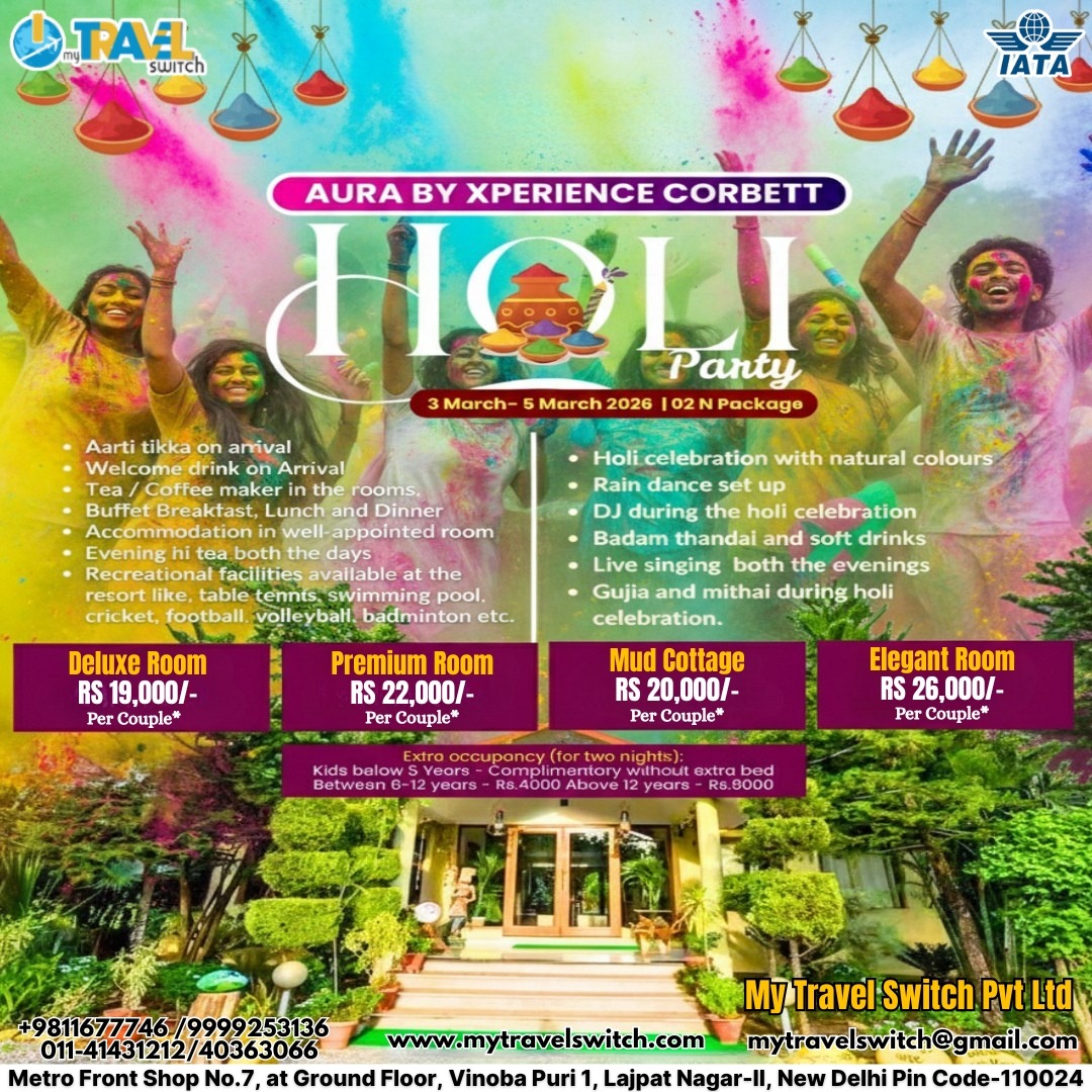 Celebrate Holi with colors, music, and nature at Aura By Xperience Corbett, located near Jim Corbett National Park. Enjoy a 2-night Holi special resort package with buffet meals, rain dance, DJ party, natural colors, live singing, festive sweets, and comfortable rooms. Book your Holi getaway with My Travel Switch Pvt Ltd for the perfect family vacation or couples retreat.