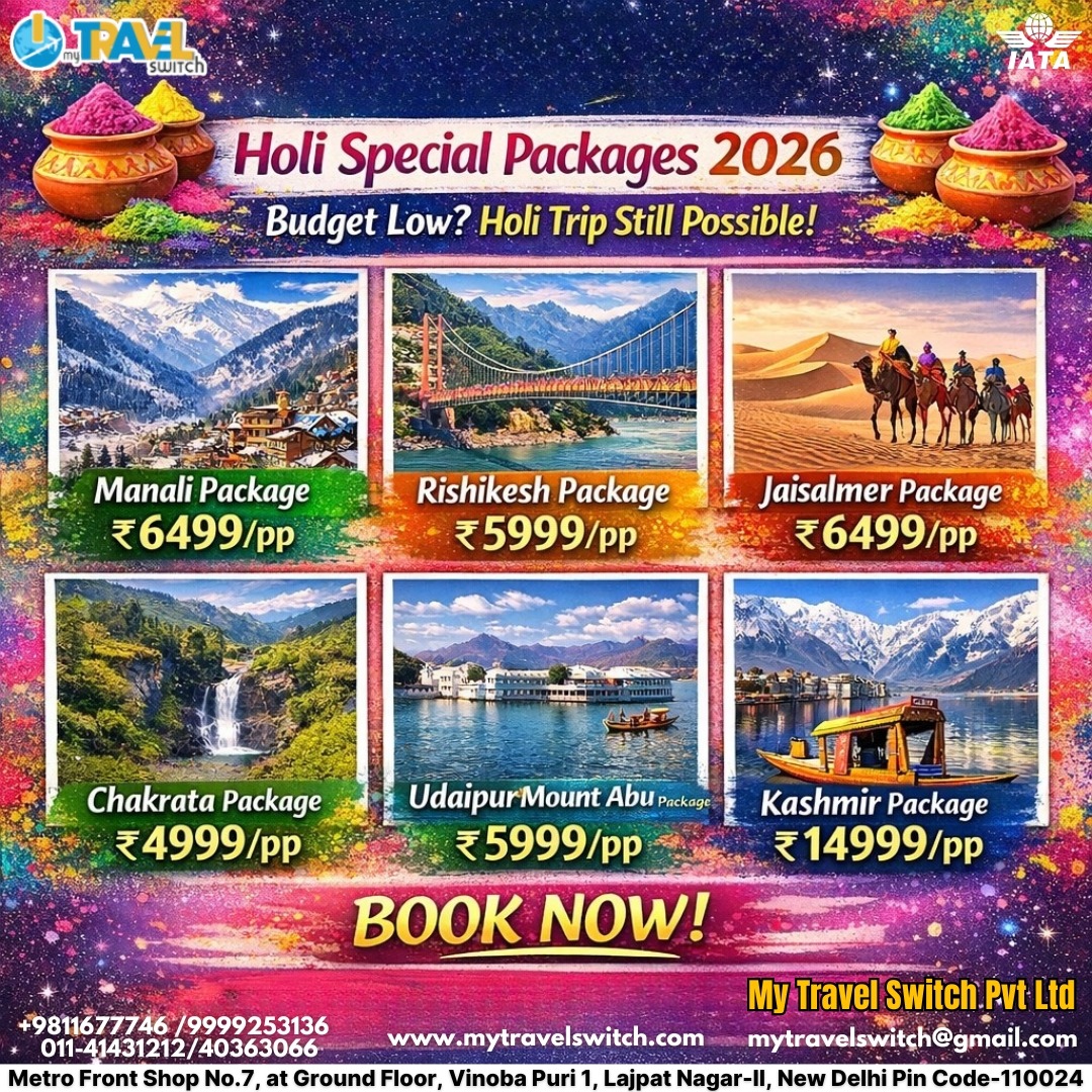 Book affordable Holi special tour packages starting at ₹4,999 per person. Explore Manali, Rishikesh, Jaisalmer, Chakrata, Udaipur, Mount Abu & Kashmir with hotel, meals, sightseeing, and transfers included. Limited Holi deals. Book now with My Travel Switch Pvt Ltd!