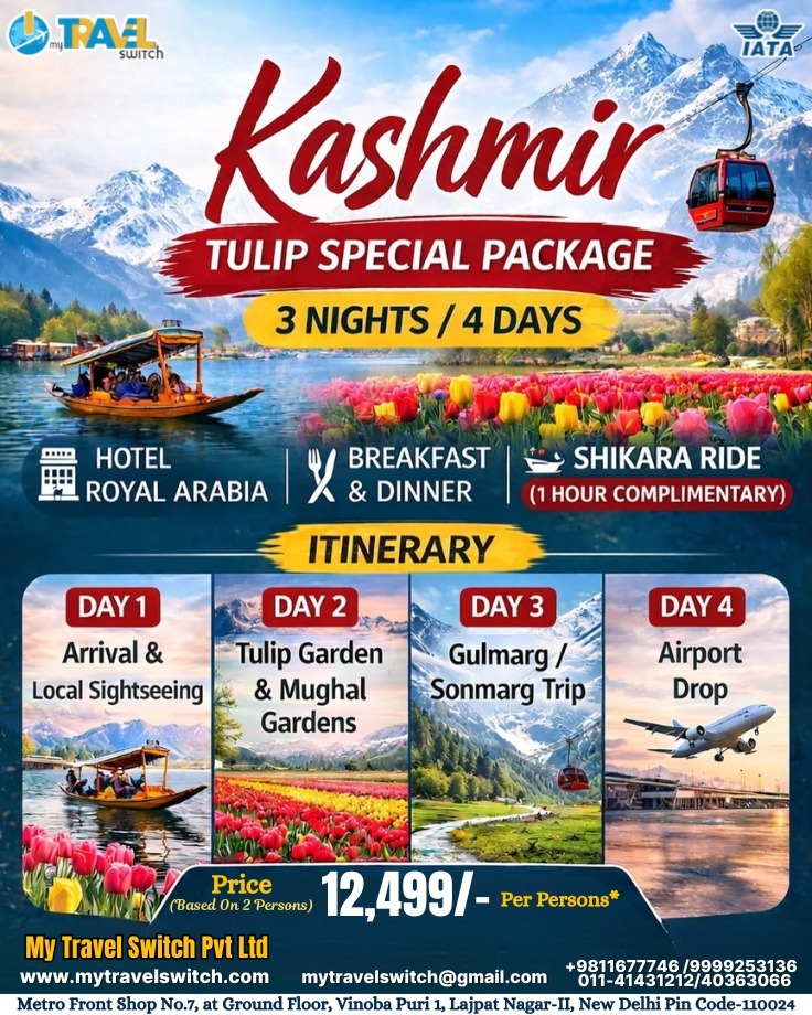 Experience the breathtaking beauty of Kashmir with our specially designed Kashmir Tulip Special Package β 3 Nights / 4 Days. This budget-friendly tour takes you through the most scenic destinations including Srinagar, Gulmarg, and Sonmarg, offering a perfect blend of nature, adventure, and relaxation.