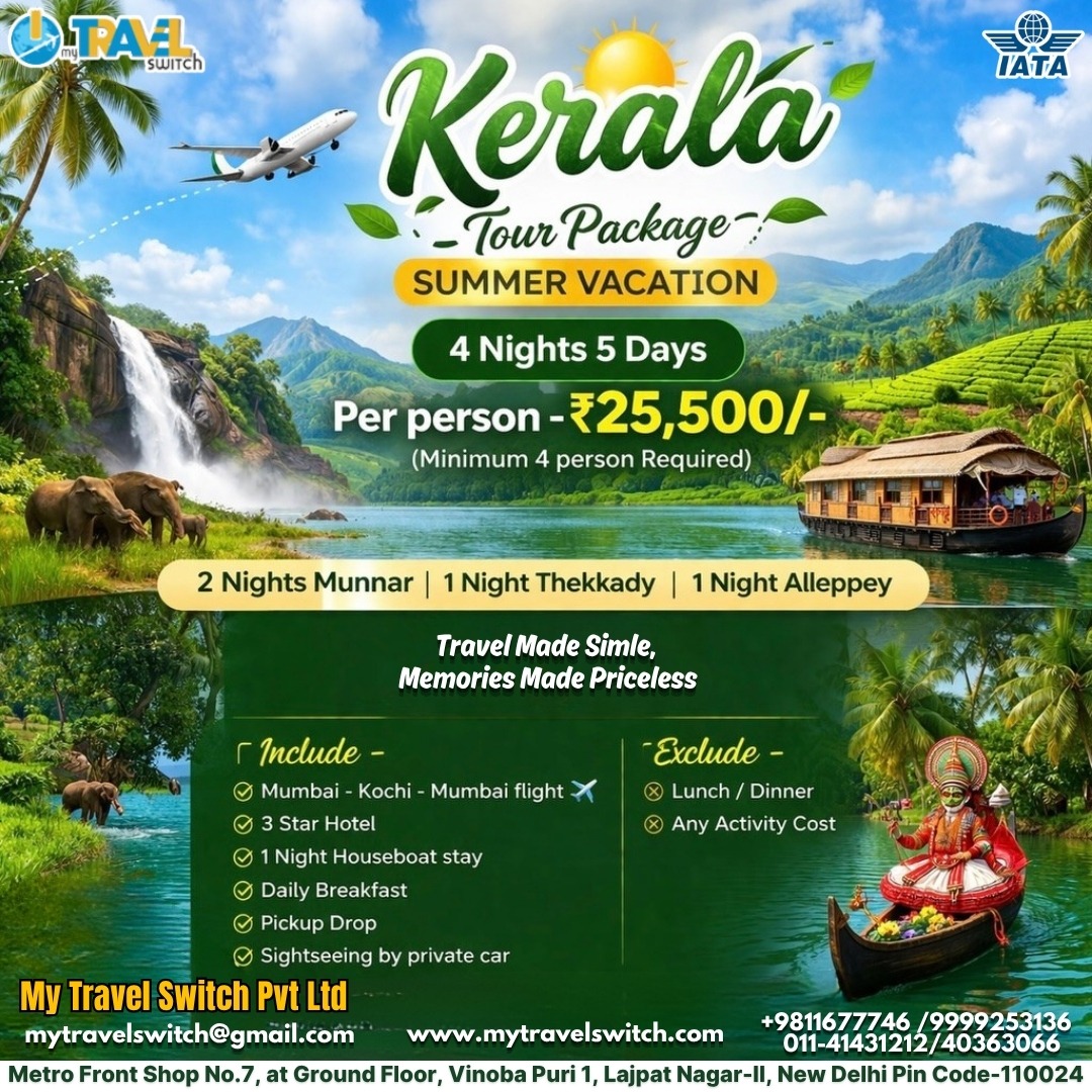 Choose the Best Kerala Tour Package Services in Lajpat Nagar, South Delhi – My Travel Switch Pvt Ltd. We offer customised local tours, curated itineraries for school holidays, weekend family getaways, and more.