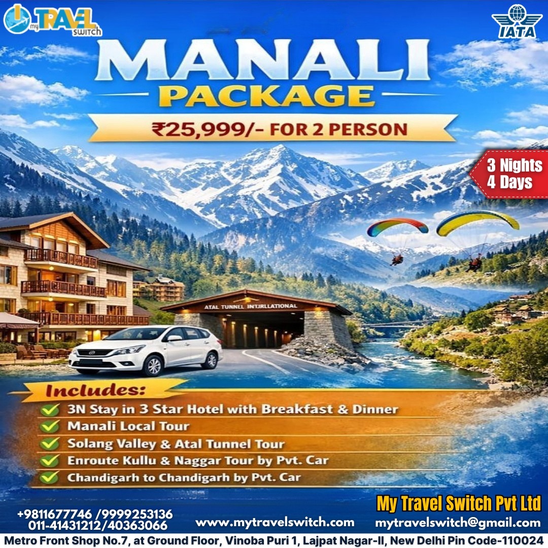 A trip to Manali is the perfect escape from city life, offering fresh mountain air, scenic beauty, and unforgettable experiences. With our all-inclusive Manali tour package, you enjoy a hassle-free vacation with stays, meals, sightseeing, and transfers all taken care of. Trust My Travel Switch Pvt Ltd to make your Manali holiday comfortable, affordable, and memorable.