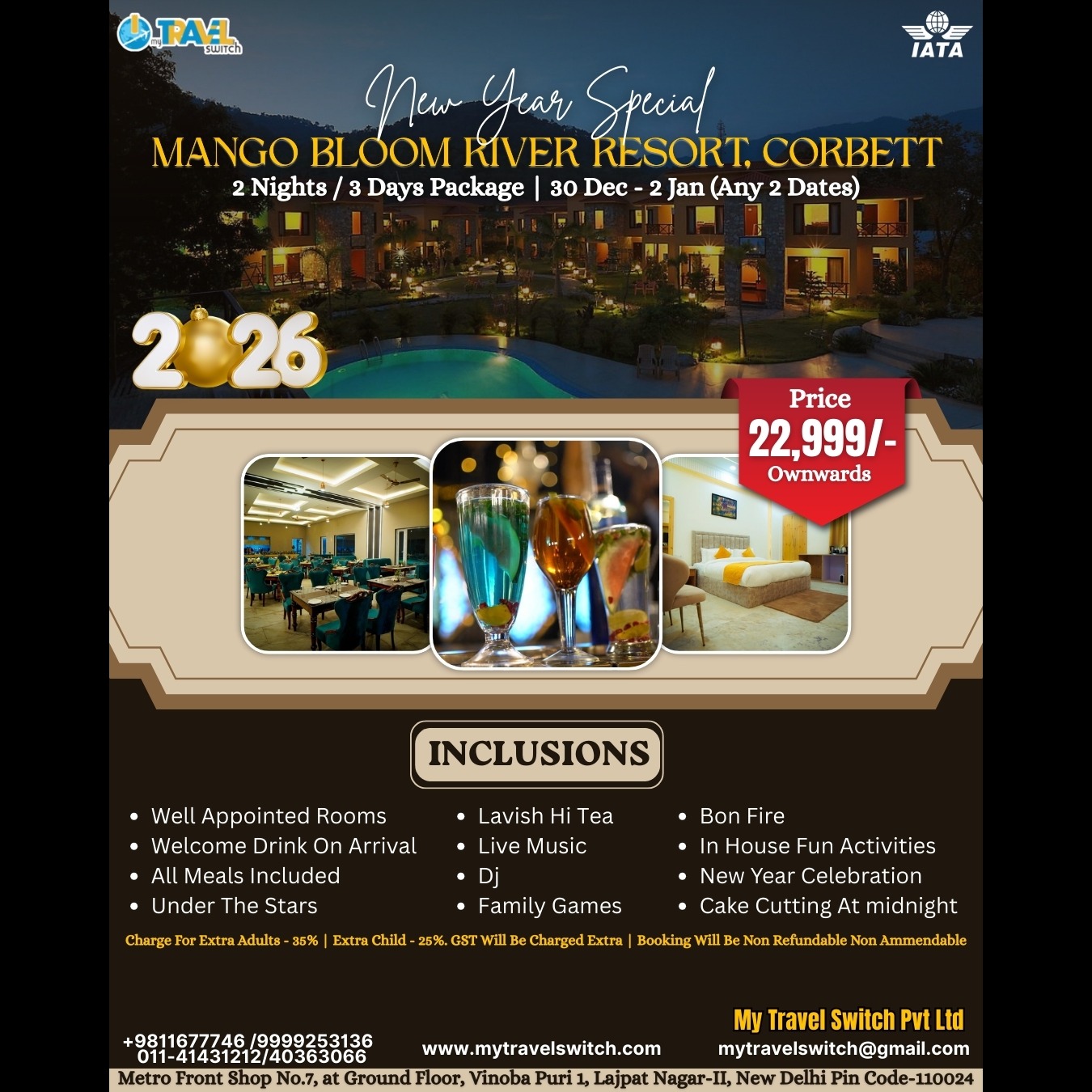 Celebrate New Year 2026 in the heart of nature with an exclusive 2 Nights / 3 Days New Year Package at Mango Bloom River Resort, Corbett. Enjoy luxury rooms, delicious meals, live music, DJ nights, bonfire, fun activities, and a memorable midnight celebration under the stars. Designed for families, couples, and groups, this festive getaway offers the perfect blend of comfort, entertainment, and nature at an unbeatable price starting from βΉ22,999 onwards.