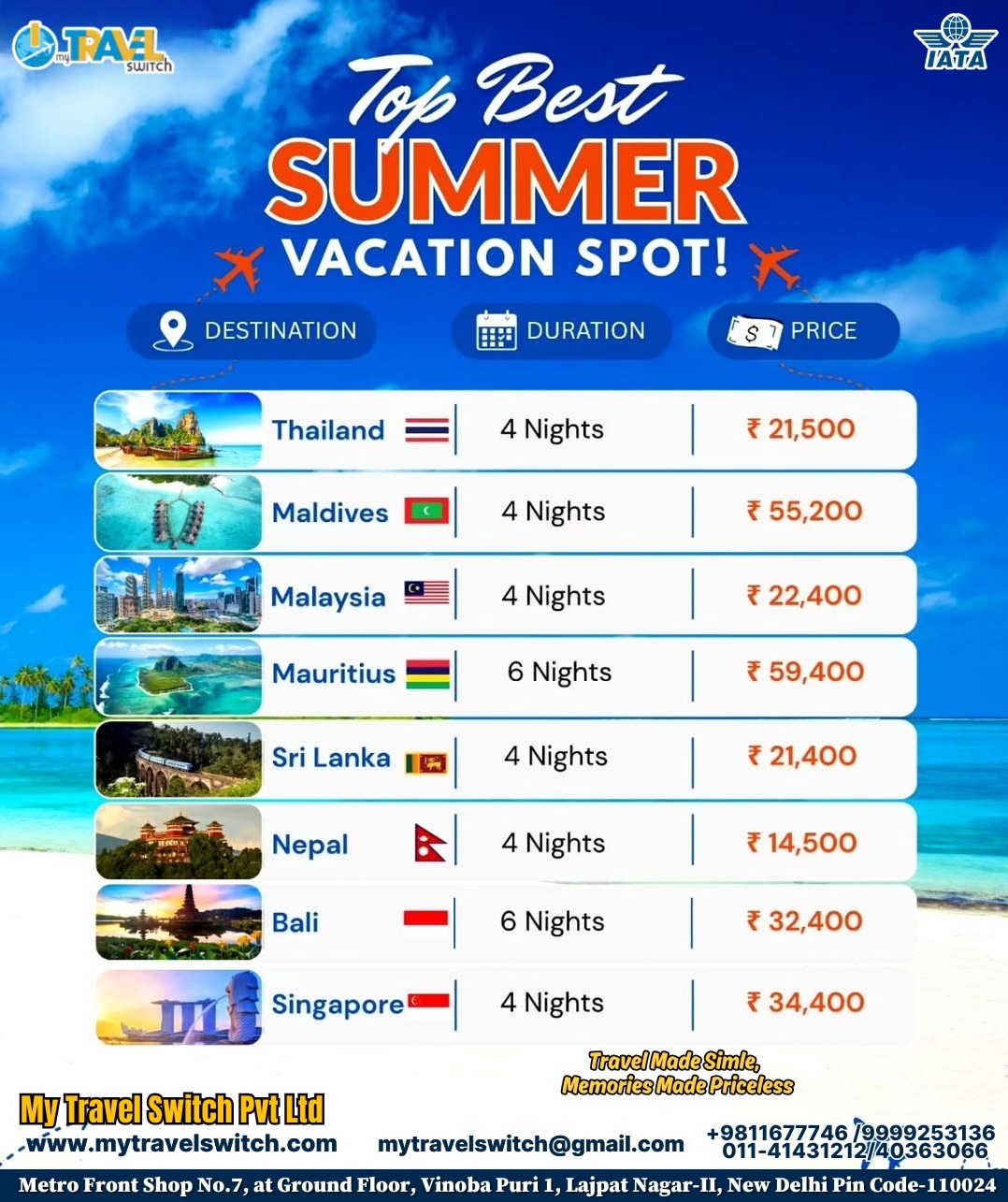 Discover the best summer vacation destinations from India with affordable international tour packages. Choose from Thailand, Maldives, Malaysia, Mauritius, Sri Lanka, Nepal, Bali, and Singapore with packages starting from just ₹14,500. Enjoy budget-friendly holidays with comfortable stays, sightseeing, and unforgettable travel experiences. Book your perfect summer getaway today with the best deals on international travel packages.