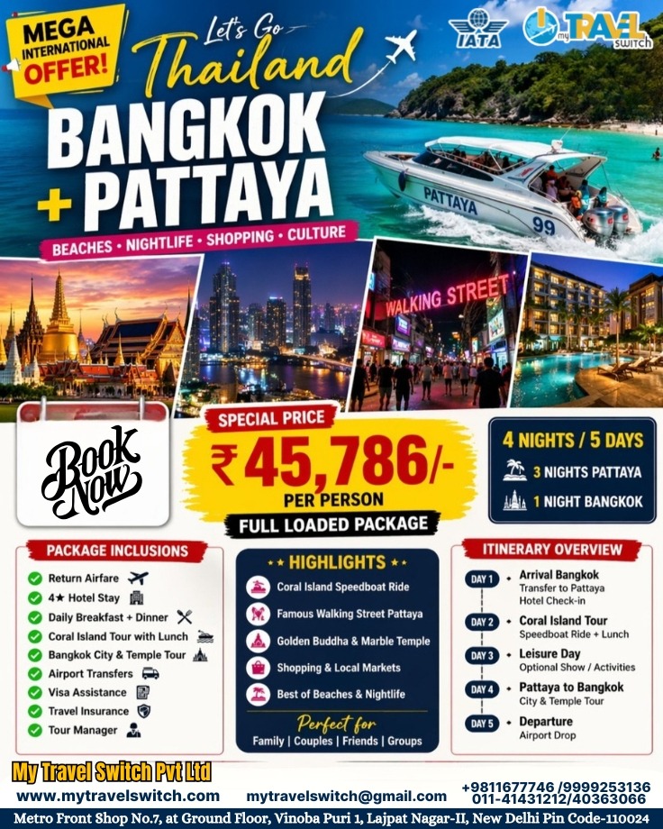 Explore the beauty of Thailand with our affordable Bangkok Pattaya tour package from India. Enjoy a 4 Nights 5 Days Thailand holiday covering stunning beaches, vibrant nightlife, cultural landmarks, Coral Island tour, and luxury stays. This all-inclusive Thailand package includes return airfare, hotel stay, meals, transfers, visa assistance, and sightseeing tours. Book your Thailand vacation package now at the best price and experience unforgettable memories with My Travel Switch.