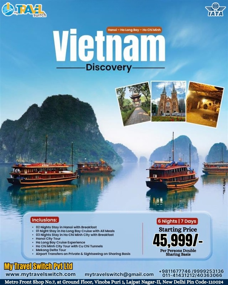 Book your Vietnam Discovery Tour Package (6 Nights / 7 Days) starting from βΉ45,999 per person. Explore Hanoi, enjoy a luxury Halong Bay cruise, visit Ho Chi Minh City, Cu Chi Tunnels, and Mekong Delta. Includes hotel stays, meals, transfers, and sightseeing. Perfect for couples, families, and group travelers.