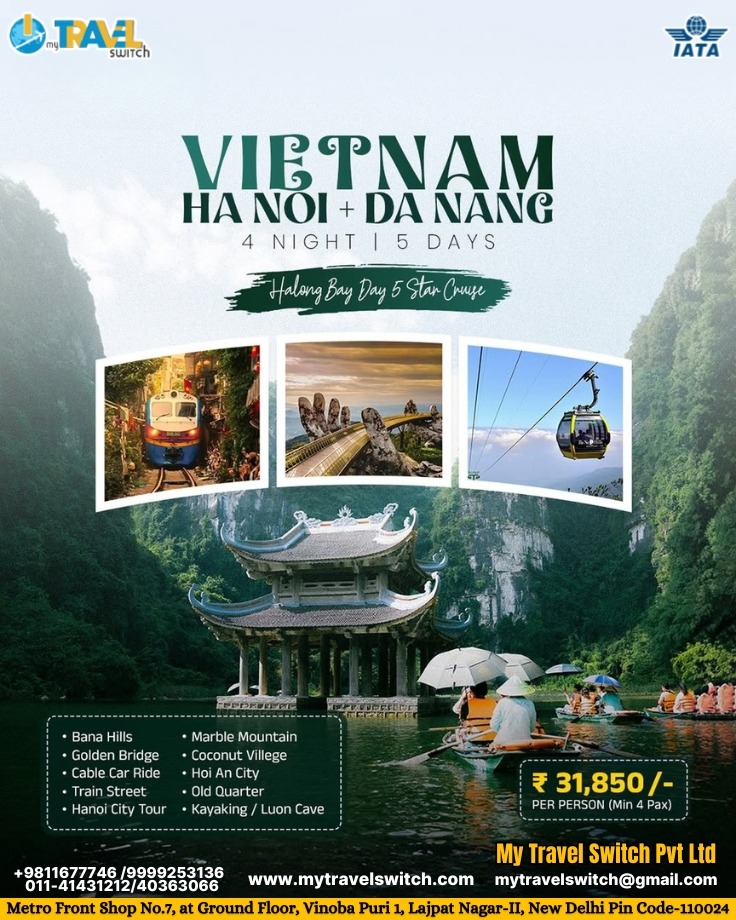 If you are looking for the best Vietnam tour package from Delhi, this Hanoi + Da Nang + Halong Bay 4 Nights 5 Days package is the perfect choice for your next international holiday. From the stunning Golden Bridge and scenic Bana Hills to the magical Halong Bay cruise, exciting kayaking, and the cultural charm of Hoi An and Hanoi, this package offers the perfect combination of adventure, relaxation, and sightseeing. Book now with My Travel Switch Pvt Ltd and enjoy an affordable, memorable, and well-planned Vietnam holiday package from India.